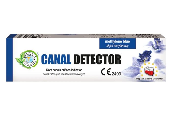 El producto CANAL DETECTOR está destinado a utilizarse durante el tratamiento endodóntico para identificar los orificios del conducto radicular. El colorante azul contenido en el producto penetra en los orificios del conducto radicular, tiñéndolos de azul y facilitando la localización de los orificios principales del conducto radicular y de cualquier fisura.