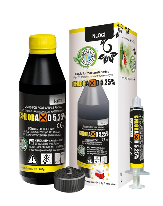 Líquido para el lavado del conducto radicular. Eliminación de residuos de pulpa muerta durante la preparación mecánica del conducto radicular. Limpia el conducto y elimina la capa de barrillo para exponer los orificios del conducto radicular dentinario antes del obturación definitiva.