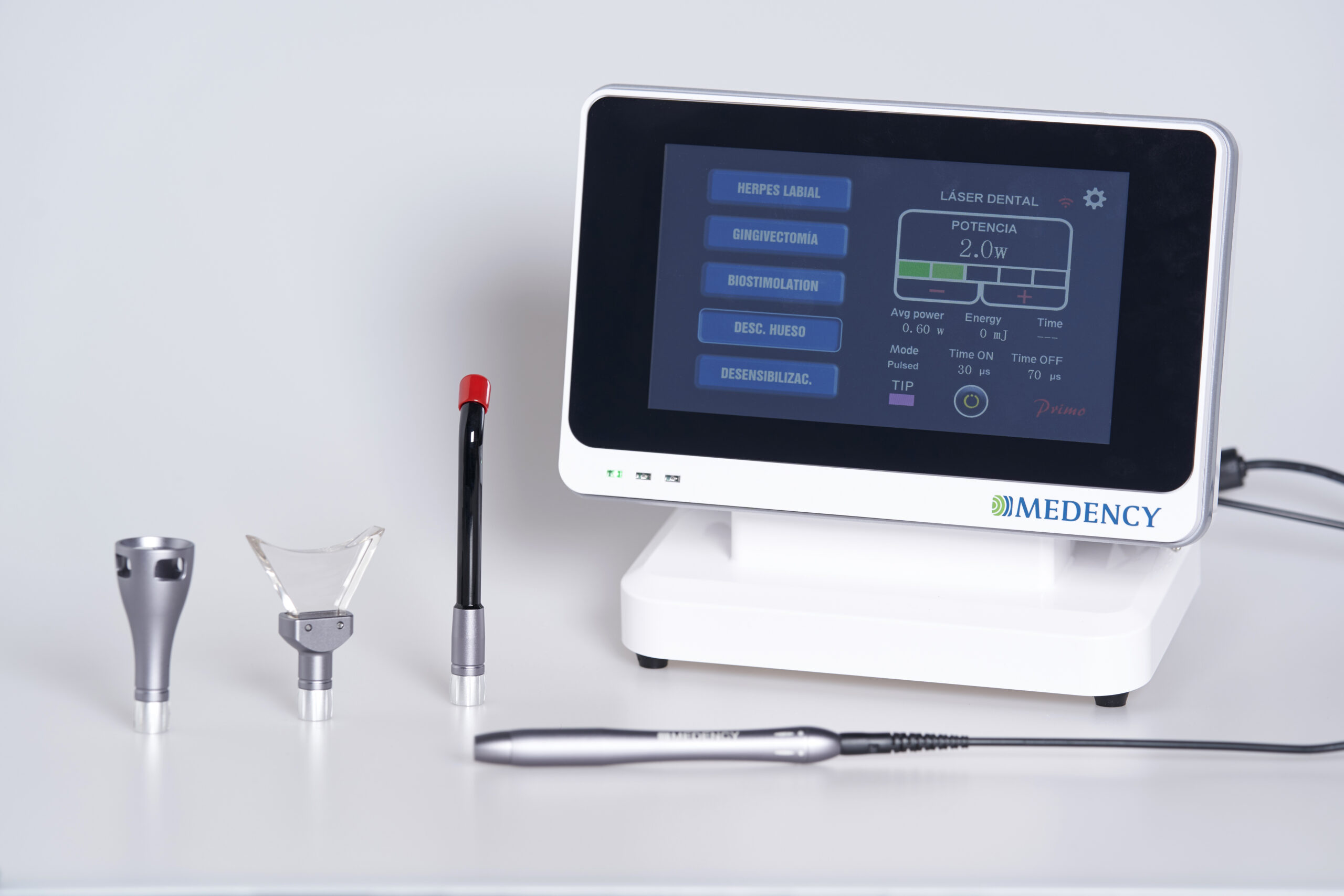 Láser de diodo. Características: Longitud de onda: 810 nm. con 7W y 980 nm. con 10w. Potencia 10 Watts CW. Pantalla táctil 7ancho. 35 Programas personalizables. Selección Menú de Favoritos. Puntas Autoclavables. Arco-tip para blanqueamiento. Bio-tip para Biostimulación. Menú multilingüe.